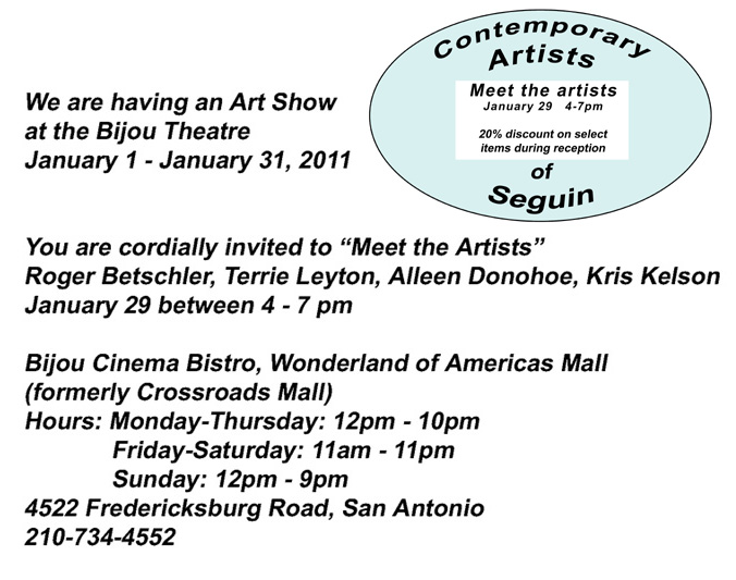Seguin Studio Tour; August 15, 2009; 15 Arrowhead Bluff, Seguin, TX; Art available for sale