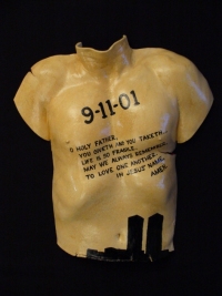 "9/11" (C-83) 2001 (mod. 2006) Size (H/W/D): 21.75” x 19.25” x 3.25” Weight: 6.75 lbs. Earthenware with glaze. This piece is in remembrance of the World Trade Center and all who lost their lives there that fateful day. Price: $800.00 SOLD CLICK HERE FOR LARGER IMAGE AND OR PURCHASE |